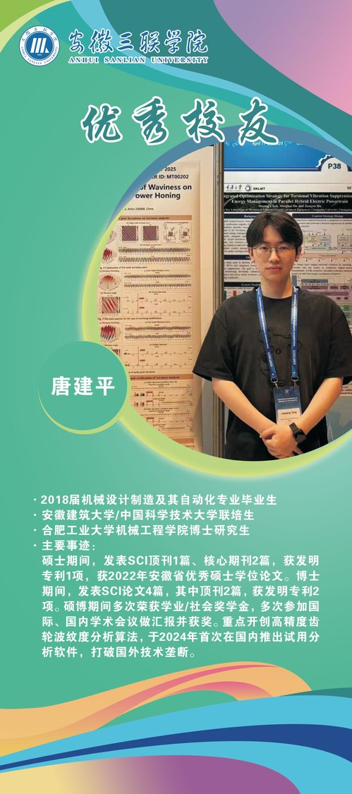 唐建平以《选择与坚持》为题,分享了从安徽三联学院机械设计制造及其自动化专业到合肥工业大学机械工程学院攻读博士的研途足迹。他专注于齿轮精密加工研究,独立开发出齿轮波纹度分析软件,成功打破国外技术垄断,为我国新能源汽车核心部件制造贡献智慧。