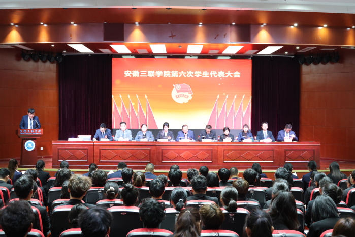 12月3日,安徽三联学院第六次学生代表大会在图书馆学术报告厅顺利召开。省教育督导专员、校党委书记王光虎,校党委副书记、副校长赵翀,安徽省学生联合会驻会执行主席葛方羽,校党委班子成员,三院三部党委书记、学管主任、分团委书记,学生处、团委主要负责人参加大会开幕式。