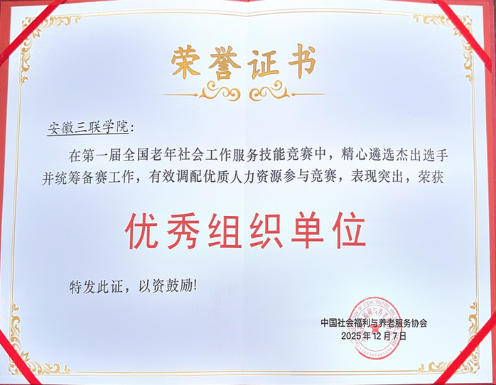 近日,第一届全国老年社会工作服务技能竞赛总决赛顺利落下帷幕。安徽三联学院三支参赛团队均获优秀奖,同时,学校还被授予优秀组织单位称号,实现竞赛成绩与组织荣誉双丰收。此次竞赛由中国社会福利与养老服务协会主办,以“锤炼专业技能,赋能老年服务”为宗旨,设置了团体情景演示、实务方案答辩等多个环节,全面考察团队理论应用、现场处置及协作能力。