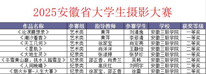 在2025年安徽省大学生摄影作品大赛中,作品《沧浪随想录》、《潮汐看客》、《大地生灵》荣获一等奖,《天工几何》等作品获得二等奖。