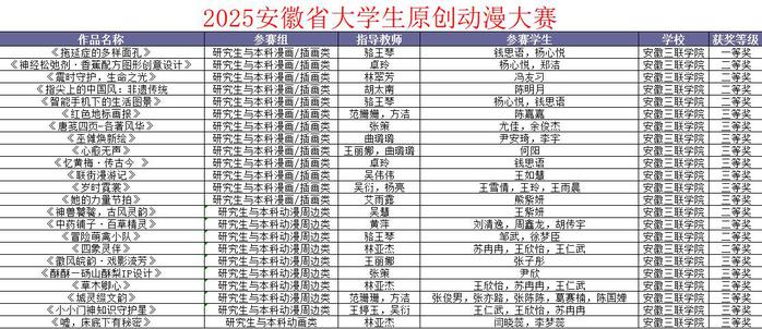 在2025年安徽省大学生原创动漫大赛中,作品《拖延症的多样面孔》荣获漫画/插画类一等奖;《中药铺子·百草精灵》、《徽风皖韵·戏影流芳》等作品分获各品类二、三等奖。