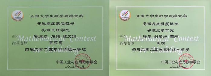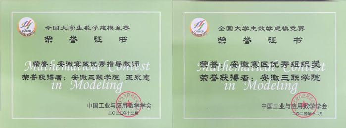 近日,2025年“高教社杯”全国大学生数学建模竞赛成绩揭晓。我校学子在比赛中奋力拼搏、勇于创新,在赛事中表现优异,共荣获安徽赛区本科组一等奖2项、二等奖5项、三等奖14项,安徽三联学院获“安徽赛区优秀组织奖”。