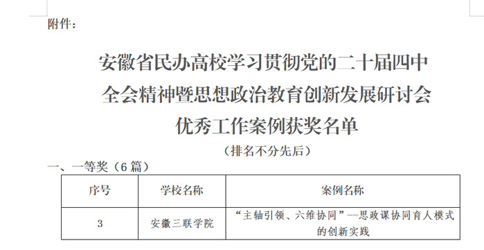 该评选是在“安徽省民办高校学习贯彻党的二十届四中全会精神暨思想政治教育创新发展研讨会”期间组织开展,旨在总结推广思政工作创新成果。我校案例围绕思政课协同育人模式进行系统探索,突出理论结合实践,体现了我校在思想政治教育领域的持续创新与扎实成效。