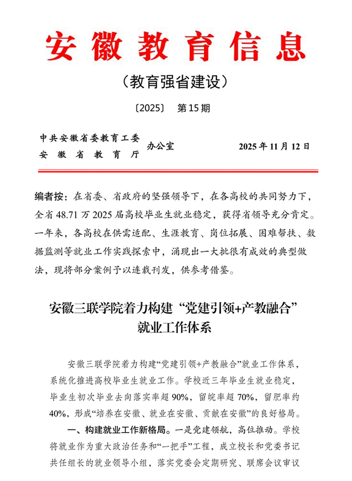 2025届毕业生初次去向落实率位居全省本科高校前列。学校获“安徽省高校毕业生就业工作成效突出单位”通报表扬,“党建引领+产教融合”就业工作案例被《安徽教育信息(教育强省建设)》刊发推介,形成良好示范效应。