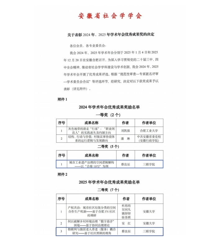 近日,安徽省社会学学会公布了2024年、2025年优秀成果评选结果。我校马克思主义学院教师蔡良辰的两项研究成果入选获奖名单,并连续两年在学会年会上作主旨发言,充分体现了学校在社会学及相关学科领域持续推进学术研究与成果培育的显著成效。