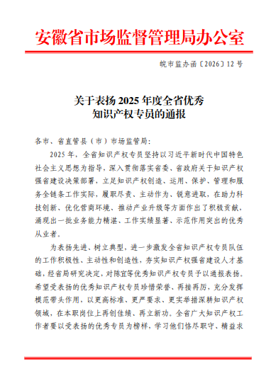 近日,安徽省市场监督管理局印发《关于表扬2025年度全省优秀知识产权专员的通报》,我校科研处商迎美老师凭借在知识产权管理、服务与转化工作中的优异表现,从全省众多参选专员中脱颖而出,荣获“安徽省优秀知识产权专员”称号。