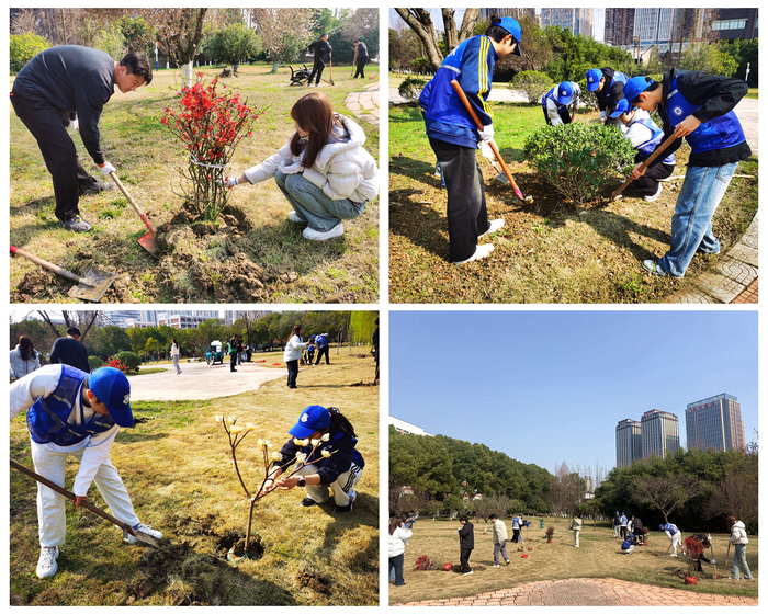 植树活动中,师生们挽起衣袖,挖泥铲土、扶苗培土、浇水灌溉,大家分工明确,配合默契,现场一派繁忙有序的景象。在师生的共同努力下,A楼后侧大草坪共完成栽种30株结香花、海棠树和黄杨球,在和煦的春风里洋溢着勃勃生机。