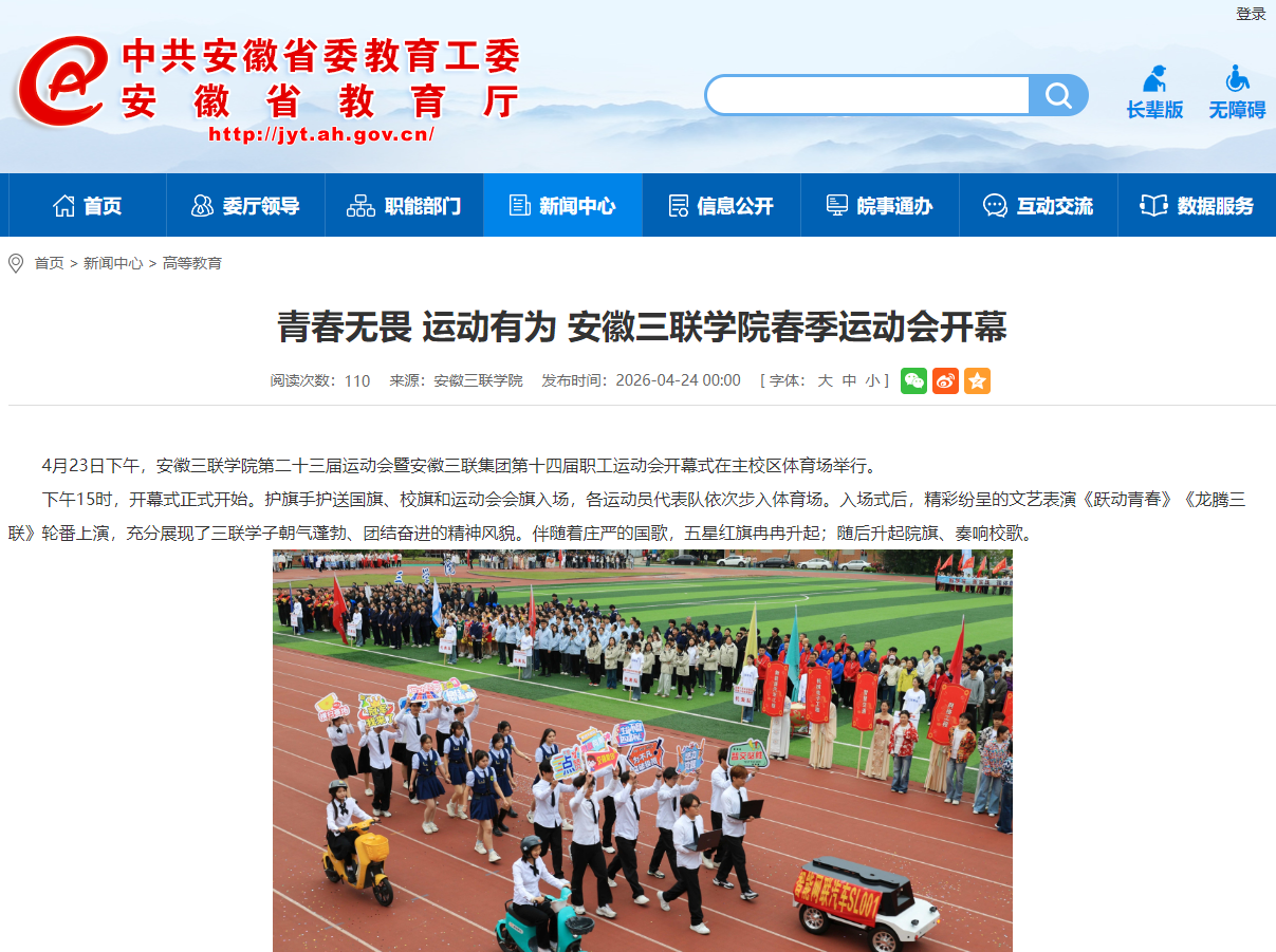 • 4月23日下午,安徽三联学院第二十三届运动会暨安徽三联集团第十四届职工运动会开幕式在主校区体育场举行。三联创始人金会庆,省教育督导专员、校党委书记王光虎,安徽三联集团董事长余皖生,校长江秀丽等领导参加开幕式。开幕式由副校长宋梦岚主持。下午15时,开幕式正式开始。护旗手护送国旗、校旗和运动会会旗入场,各运动员代表队依次步入体育场。入场式后,精彩纷呈的文艺表演《跃动青春》《龙腾三联》轮番上演,充分展现了三联学子朝气蓬勃、团结奋进的精神风貌。伴随着庄严的国歌,五星红旗冉冉升起;随后升起校旗、奏响校歌。江秀丽致开幕词。她首先向为本届运动会辛勤付出的全体师生表示感谢,向运动员、裁判员致以崇高敬意。她指出,体育强则中国强,学校始终将体育摆在育人全局的重要位置。过去一年,三联学子在各类体育竞赛中争金夺银、屡破纪录,用昂扬姿态诠释了 “勇闯难关、拼搏向前、开拓创新、争创辉煌” 的三联精神,积极响应了创始人金会庆教授在新生开学典礼上 “读好书、勤实践、强体魄” 的殷切寄语。她强调,运动会不仅是体育竞技的盛会,更是一堂生动的成长教育课。她勉励全体师生,紧扣 “青春无畏,运动有为” 的主题,在赛场上挥洒汗水