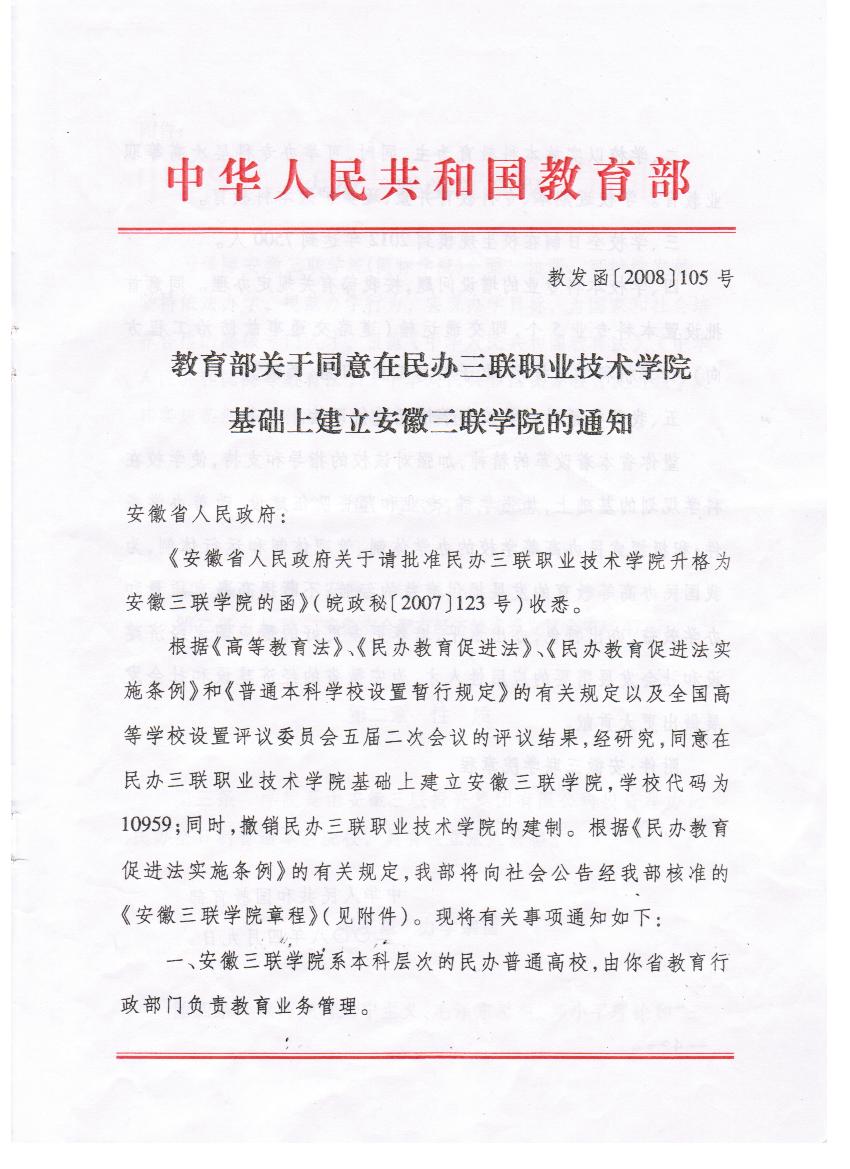 2008 教育部批准升格普通本科高校 定名安徽三联学院