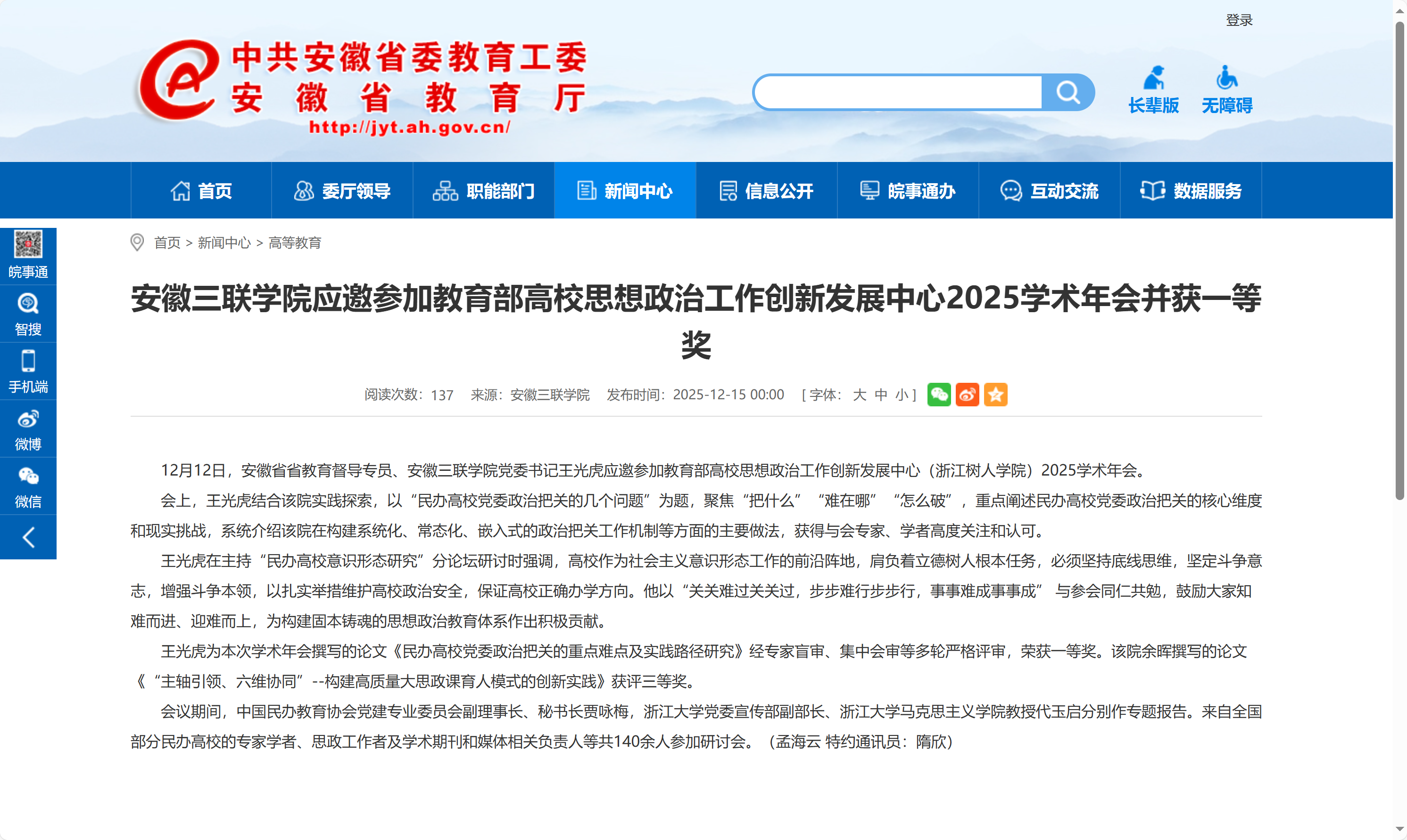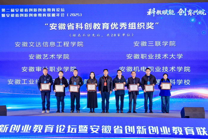 12月20日,第二届安徽省创新创业教育论坛暨安徽省创新创业教育联盟年会在合肥举办,我校凭借在创新创业教育方面的扎实工作,荣获“安徽省科创教育优秀组织奖”。同时,两位教师获评“安徽省科创导师”称号,一支学生团队在安徽省科创之星培育计划创新创业邀请赛中获得铜奖。创新创业学院及师生素质能力发展中心相关负责同志带领学生团队参加了本次活动。本次论坛由安徽省创新创业联盟(以下简称“联盟”)主办,聚焦“科教赋能,创育兴皖”这一主题。联盟由安徽省教育厅主管,省财政厅、人社厅、科技厅等单位指导,由中国科学技术大学担任理事长单位,现已汇集了100家优秀成员单位。旨在通过融合“教育链、科研链、产业链、资金链”,系统性推动全省创新创业人才的培养与生态建设。作为联盟的首批高校成员,我校始终将创新创业教育置于人才培养的核心位置。通过建立健全的组织与工作机制,将双创教育全程融入人才培养体系,定期召开专项推进会以激发师生动力。通过系统培育优秀成果、着力打造项目与竞赛品牌,学校持续扩大学生参与覆盖面,全面提升双创教育实效。(撰稿:朱竟雅 摄影:赵俊 编辑:柯嫦女)