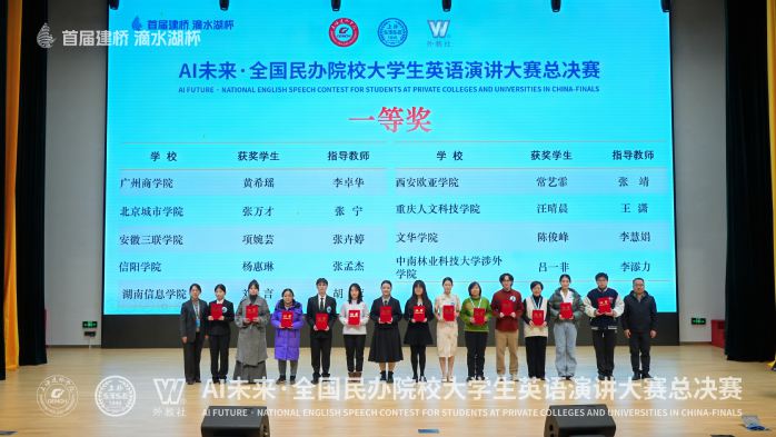 • 12月27日,首届“滴水湖杯”AI未来·全国民办院校大学生英语演讲大赛总决赛圆满落幕。我校文学部学子项婉芸表现出色,一举斩获总决赛一等奖和最佳人气奖。本届大赛聚焦“AI未来”主题,吸引了全国民办高校英语演讲精英同台竞技。赛事不仅考察选手的英语表达水平,更着重检验其逻辑思维、临场应变能力及对人工智能时代的深刻见解。备赛期间,学校为项婉芸提供了全方位支持。指导教师张卉婷量身定制训练方案,从演讲稿精心打磨到临场表现反复模拟,全程给予细致指导。项婉芸同学此次勇夺双奖,是我校长期重视学生综合素质培养、持续推进外语教学改革的生动体现。今后,学校将继续以学科竞赛为重要平台,积极拓展实践育人渠道,助力更多学子在更广阔的舞台上绽放光彩。(撰稿、摄影:张卉婷 江月华 编辑:任玥)
