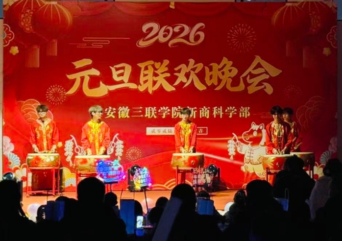 12月23日晚,新商科学部在大学生活动中心举办2026年元旦晚会。校团委、新商科学部等领导及师生代表400余人共聚一堂,喜迎新年。晚会在激昂的中国鼓表演《天地龙鳞》中拉开序幕。整场晚会分为三大篇章:在“新元启序•暖聚韶华”中,师生共舞《相亲相爱》,古筝伴舞《青花瓷》尽显国风雅韵;“青春逐光•乐绘华章”环节,歌曲串烧点燃热情,反诈小品寓教于乐;互动阶段的歌曲接龙与抽奖活动,进一步增强了师生情感。“星河揽梦•共赴新程”篇章里,《追光者》合唱温暖动人,中国风舞蹈雅致翩跹,一曲《我们走在大路上》唱响赤子心声。现场座无虚席,荧光闪烁,掌声不断。晚会在全体演员共同唱响的《我们的明天》中圆满落幕,现场洋溢着感动和对未来的美好憧憬。(撰稿:韩润曦 摄影:刘洋 编辑:任玥)