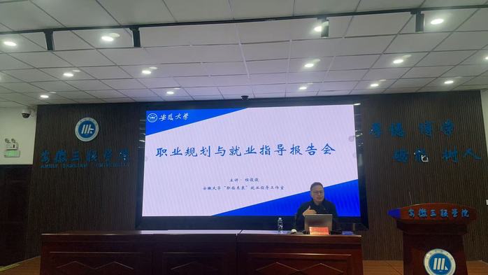 3月31日,学校在B01报告厅举办职业规划与就业指导报告会。报告会特邀安徽大学商学院辅导员、第十九届安徽省大学生职业规划大赛暨第三届全国大学生职业规划大赛课程教学赛道省赛金奖及国赛铜奖获得者程俊俊老师担任主讲。副校长操晓峰、蔡文芬参加报告会,报告会由就业创业处负责人主持。报告会上,程俊俊结合自身丰富的实践经验和教学成果,围绕职业规划大赛教师备赛策略、学生职业规划方法、公务员考试备考要点等内容进行系统讲解。报告内容详实、逻辑清晰,既有理论高度,又具实操价值,为在场师生提供了精准、实用的专业指导。未来,学校将持续完善全周期生涯教育体系,着力提升就业指导教师的教学竞赛与生涯规划指导水平,引导学生早规划、早行动,将个人发展融入国家发展和社会需要,在服务社会中实现人生价值。三院三部学管主任、辅导员代表,师生素质能力发展中心教师、职业规划与就业创业指导教研室教师,“启航团”“促航团”成员及学生代表共同参加报告会。(撰稿:洪园 摄影:吴欣蕊 编辑:夏孝登)